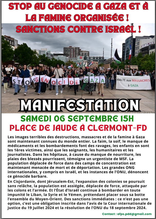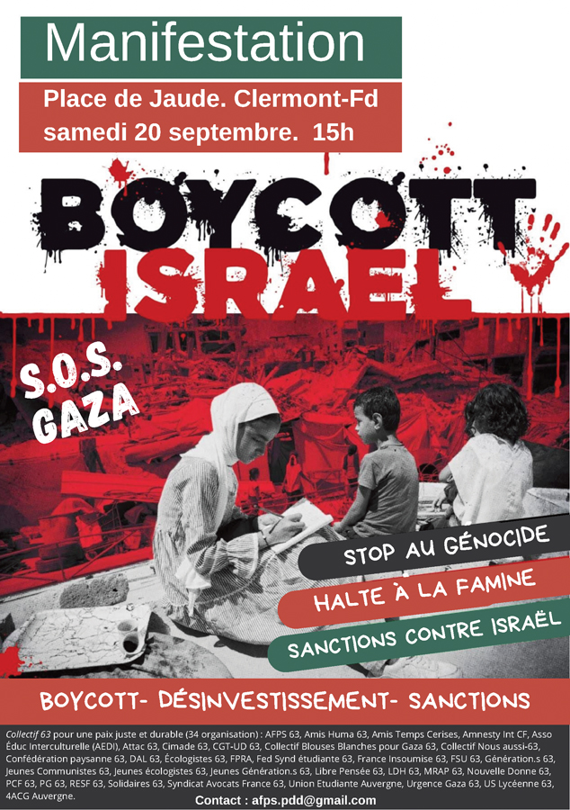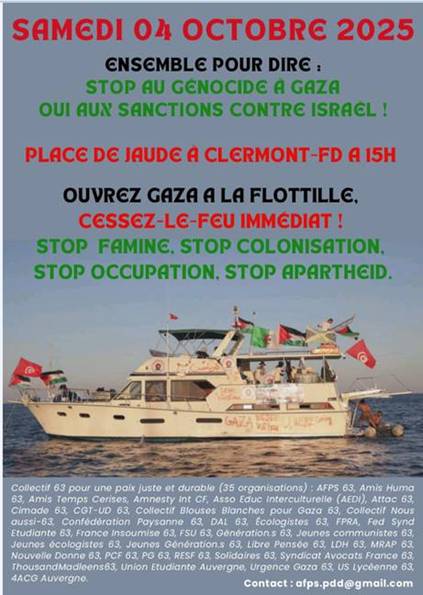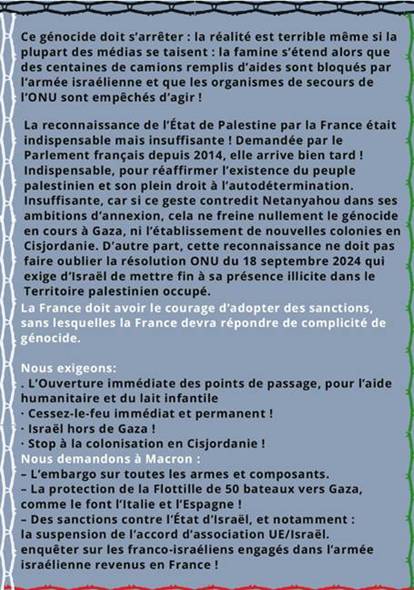 Enfin, partout dans le monde, les initiatives se multiplient pour dénoncer les crimes commis contre les Palestiniennes et Palestiniens et exiger la fin de la guerre et la protection du peuple palestinien. Parmi elles, les flottilles pour apporter une aide humanitaire à Gaza sont particulièrement importantes puisque la communauté internationale n’a toujours pas imposé à Israël de faire cesser la famine qu’il organise.
