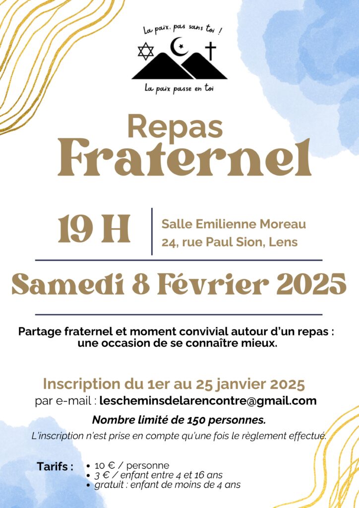 Publié le 11 janvier 202517 avril 2025 Dialogue interconvictionnel Un repas fraternel organisé le 8 février à Lens Invitation repas 08-02-25Télécharger Facebook Twitter Linkedin WhatsApp