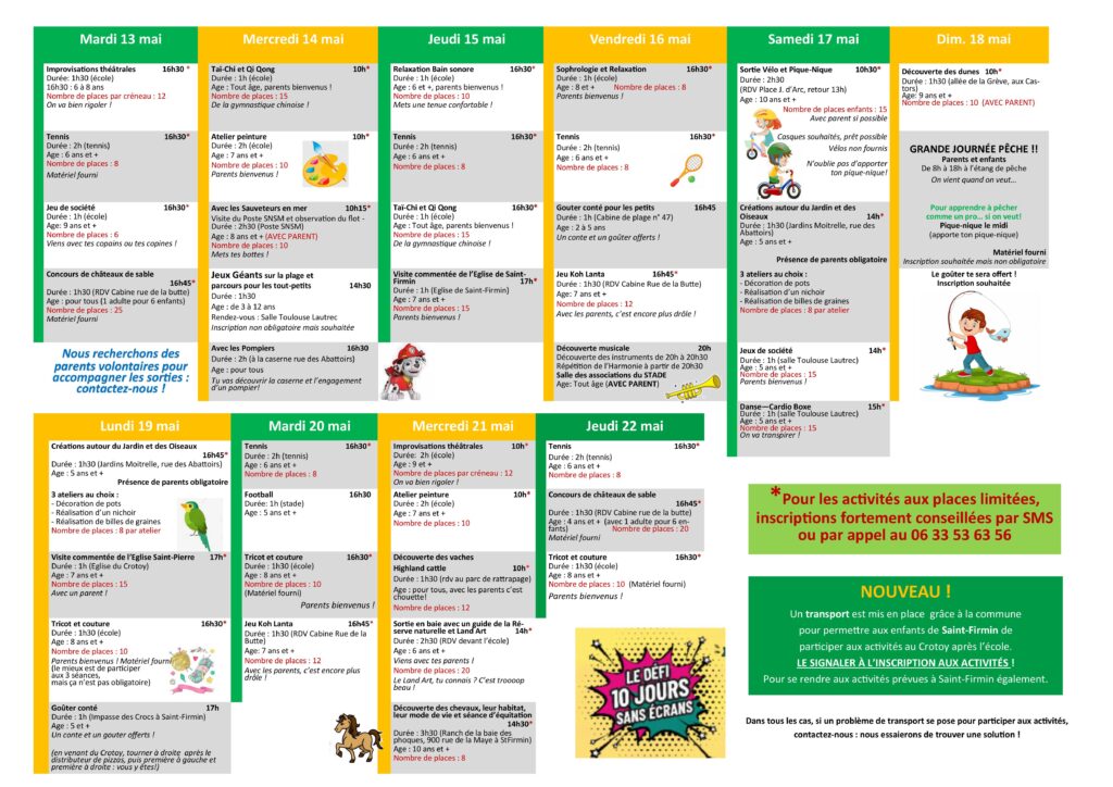 des activités proposées par la « collectivité » (associations locales, commune, parents) selon un planning défini en amont. L’accent est mis sur les activités physiques, pratiquées avec la famille et en extérieur, mais toute autre activité venant en remplacement d’un temps d’écran sera la bienvenue (découverte culturelle, cuisine, lecture de conte, soirée jeux de société, visites… toutes les idées sont bonnes !). Les enseignants peuvent également initier des activités en classes, que les enfants pourront poursuivre en dehors de l’école.