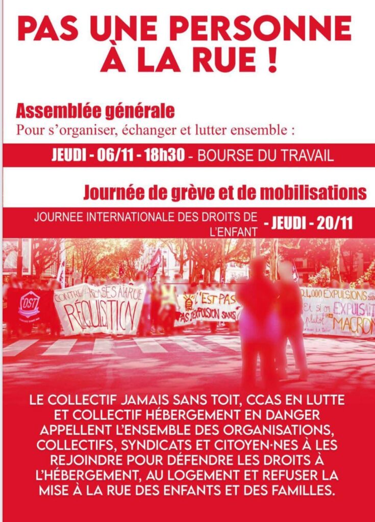 appellent l’ensemble des Organisations, Collectifs, Association, Syndicats et Citoyen-nes à les rejoindre pour défendre les droits à l’hébergement, au logement et refuser la mise à la rue des enfants et des familles.