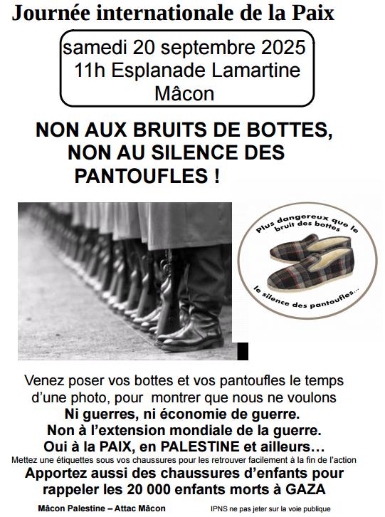 À l’occasion de la journée internationale pour la Paix (21 septembre, autre événement soutenu par la LDH Mâcon) deux événements auront lieu à Mâcon. Nous vous invitons à y participer ! L’objectif est de rappeler qu’une autre voie est possible : celle de la paix, du dialogue entre les nations et les peuples libres. Un rappel salutaire, étant donné les nombreux conflits qui continuent de se poursuivre, qu’ils soient médiatisés (Ukraine ou Gaza) ou non (Congo, Soudan, Birmanie, etc).