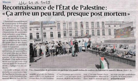 1er juin 2024 : rassemblement sur l’esplanade Lamartine aux pieds de la statue. Plus de 100 personnes étaient présentes et ont respecté 3 minutes de silence en soutien à la population de Gaza. Le texte d’un Israélien opposant à cette guerre a été lu. Nombreux gestes de soutien de passants et véhicules.