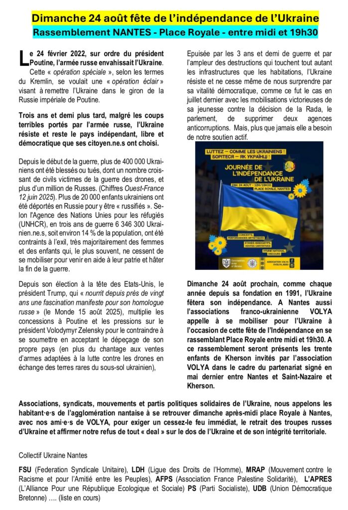 Appel à se joindre au rassemblement organisé par l’association Volya à l’occasion de la Fête de l’Indépendance de l’Ukraine ce dimanche 24 août entre midi et 19h30 Place Royale à Nantes.