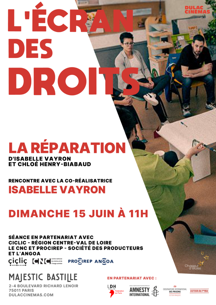Notre prochain Écran des Droits vous propose de découvrir le film :« La réparation »de Isabelle Vayron et Chloé Henry Biabaud ( 1h06 – Documentaire, 2025) le dimanche 15 juin 2025 à 11 h, au Majestic Bastille, 2-4 Bd Richard-Lenoir 75011 Paris