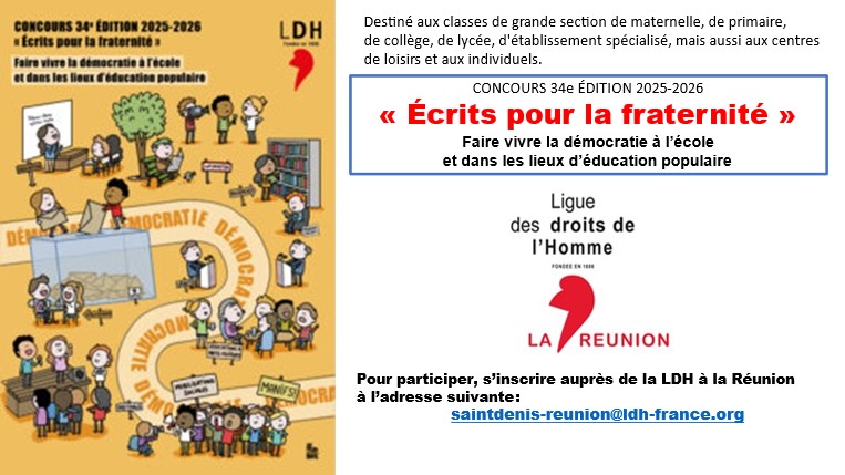 – Les enseignants sont invités à inscrire leur classe dès que possible en précisant la classe, le nombre d’élèves, les coordonnées de l’enseignant responsable et du chef d’établissement, le tout par courriel adressé à : saintdenis-reunion@ldh-france.org